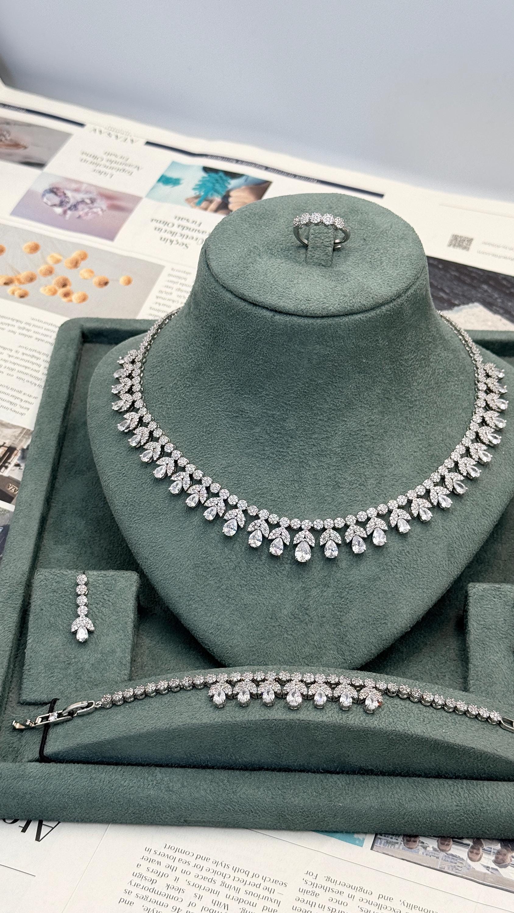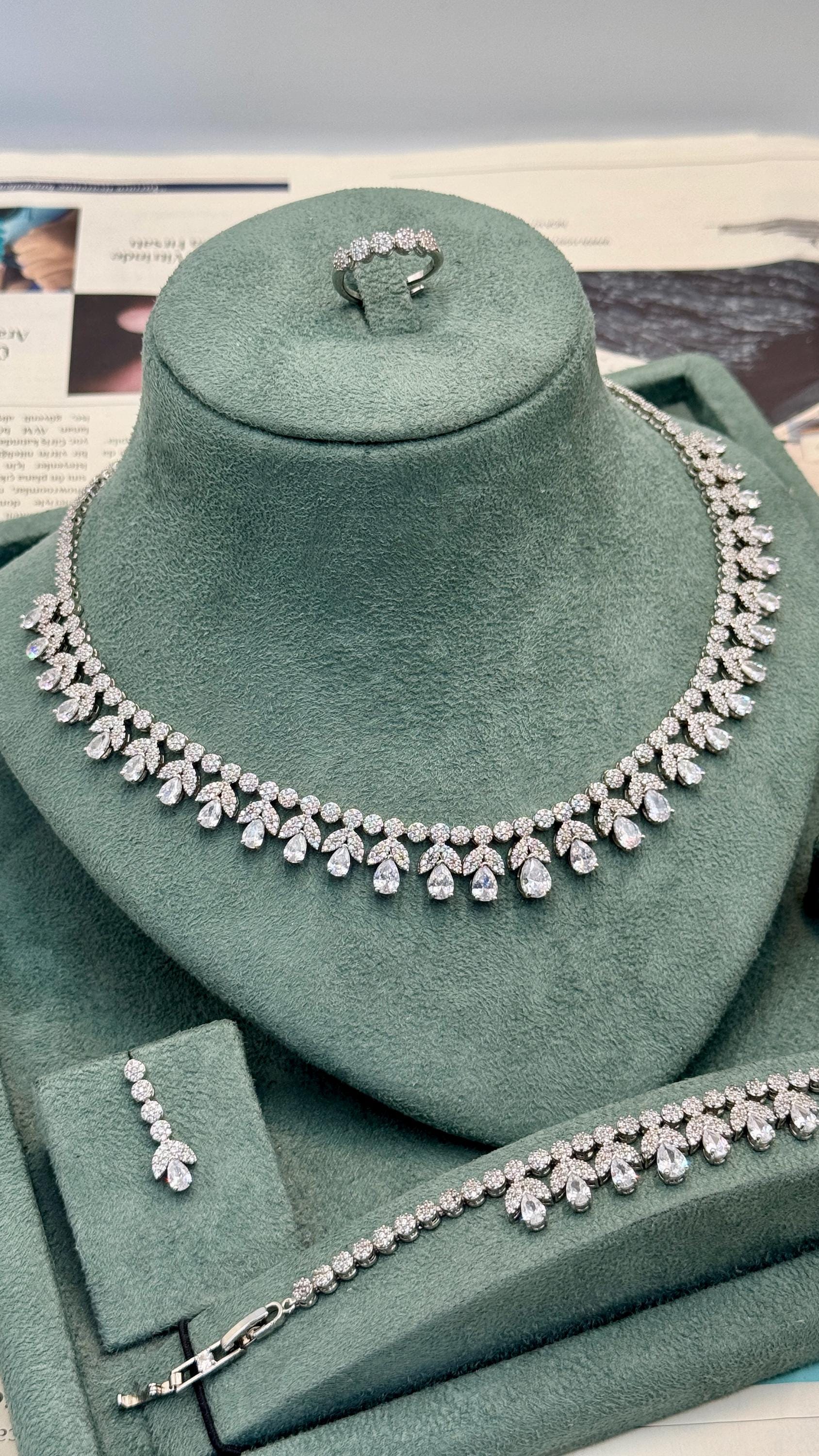 Rhodium Plated Cubic Zirconia Jewelry Set: Necklace, Earrings, Bracelet & Ring
