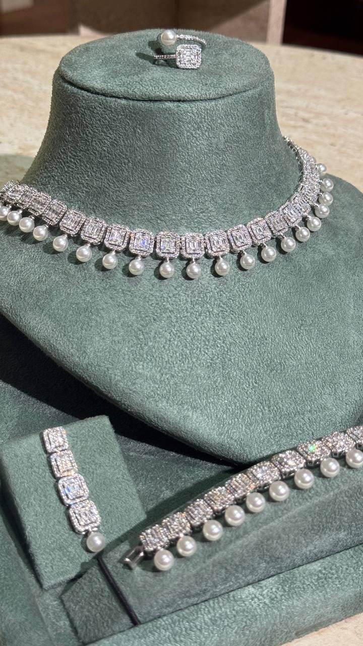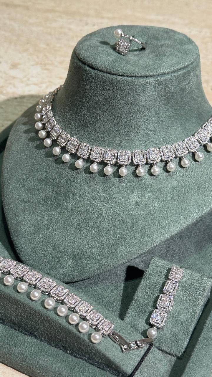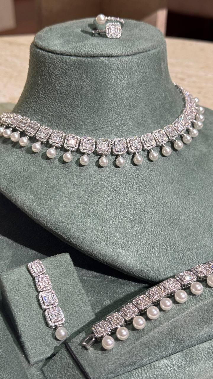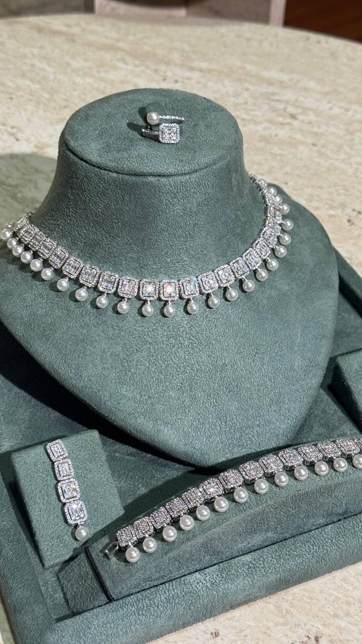 Pearl & Cubic Zirconia Jewelry Set – Necklace, Earrings, Bracelet, Ring | Silver Elegant Jewelry for Women