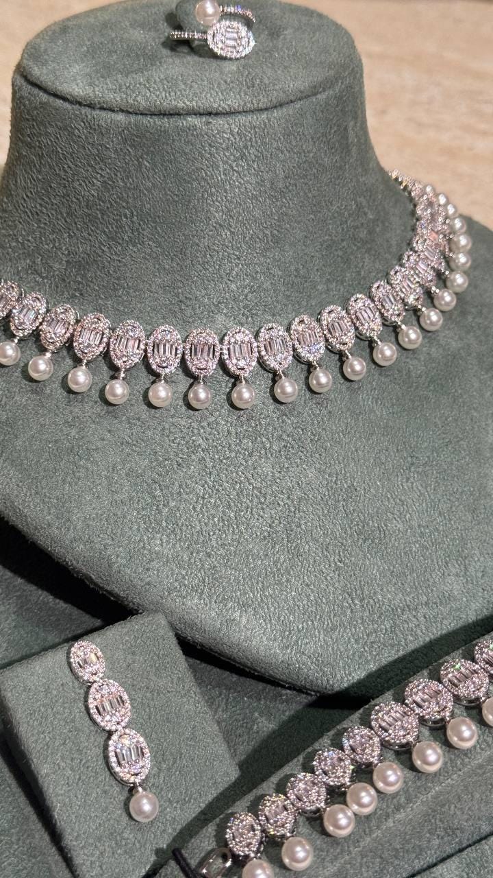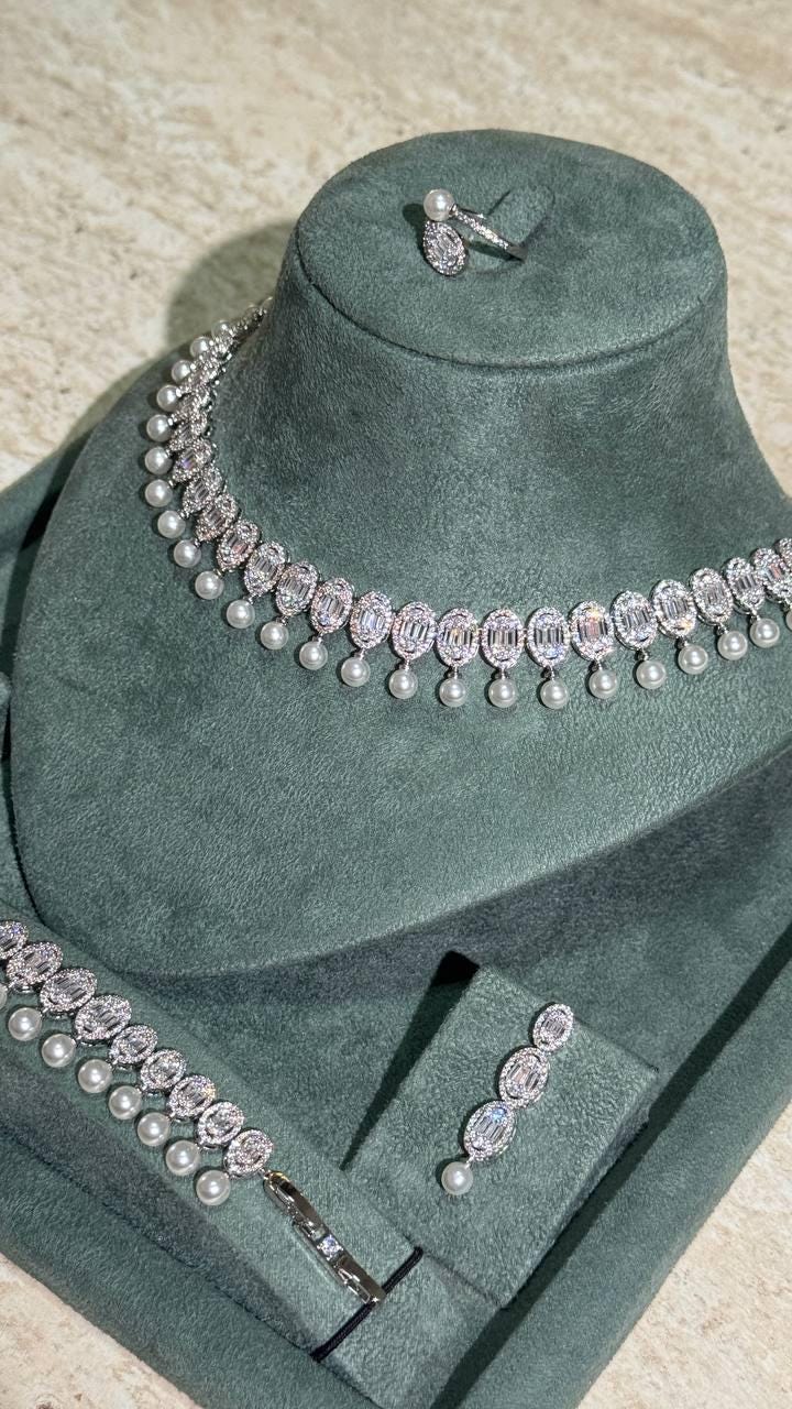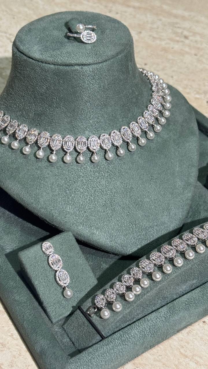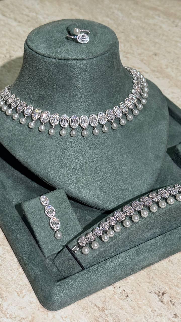 Elegance that transcends time — this luxurious bridal set combines radiant zircon stones with luminous high-grade pearls, all meticulously hand-crafted to perfection. The design blends classic charm with modern sophistication, making it ideal for weddings, engagements, and elegant soirées.
