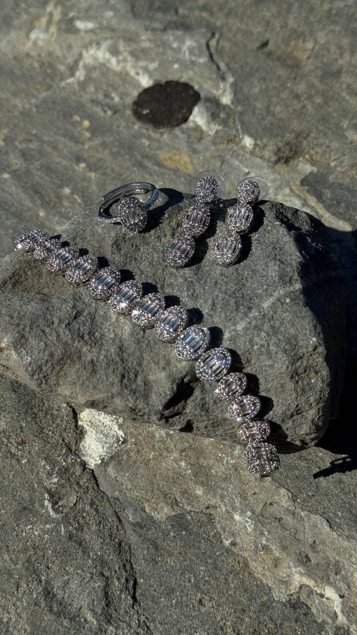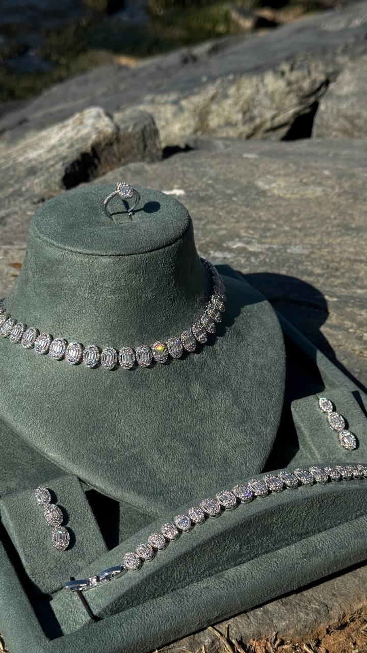 Zircon Jewelry Set: Rhodium Necklace, Bracelet, Earrings & Ring
