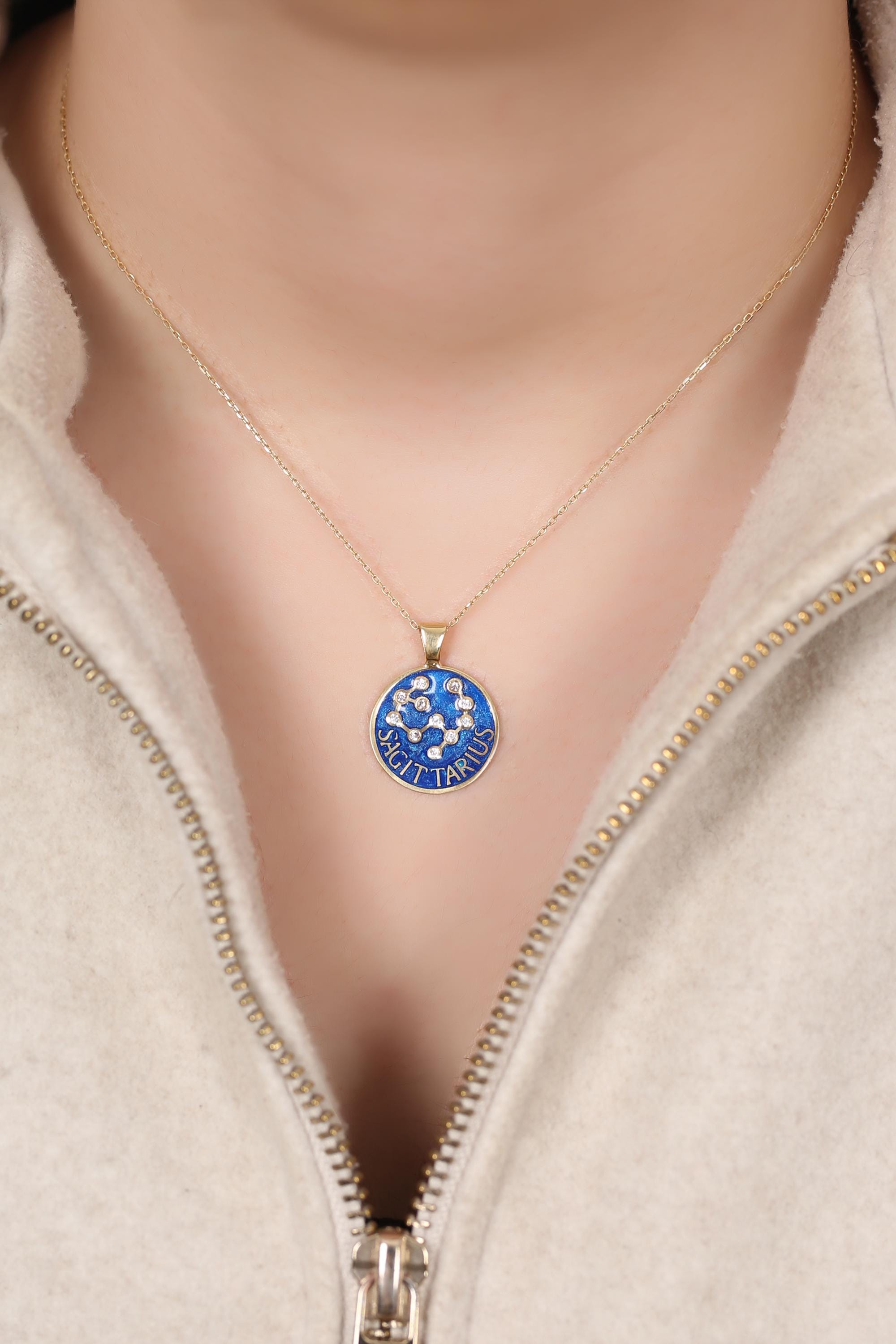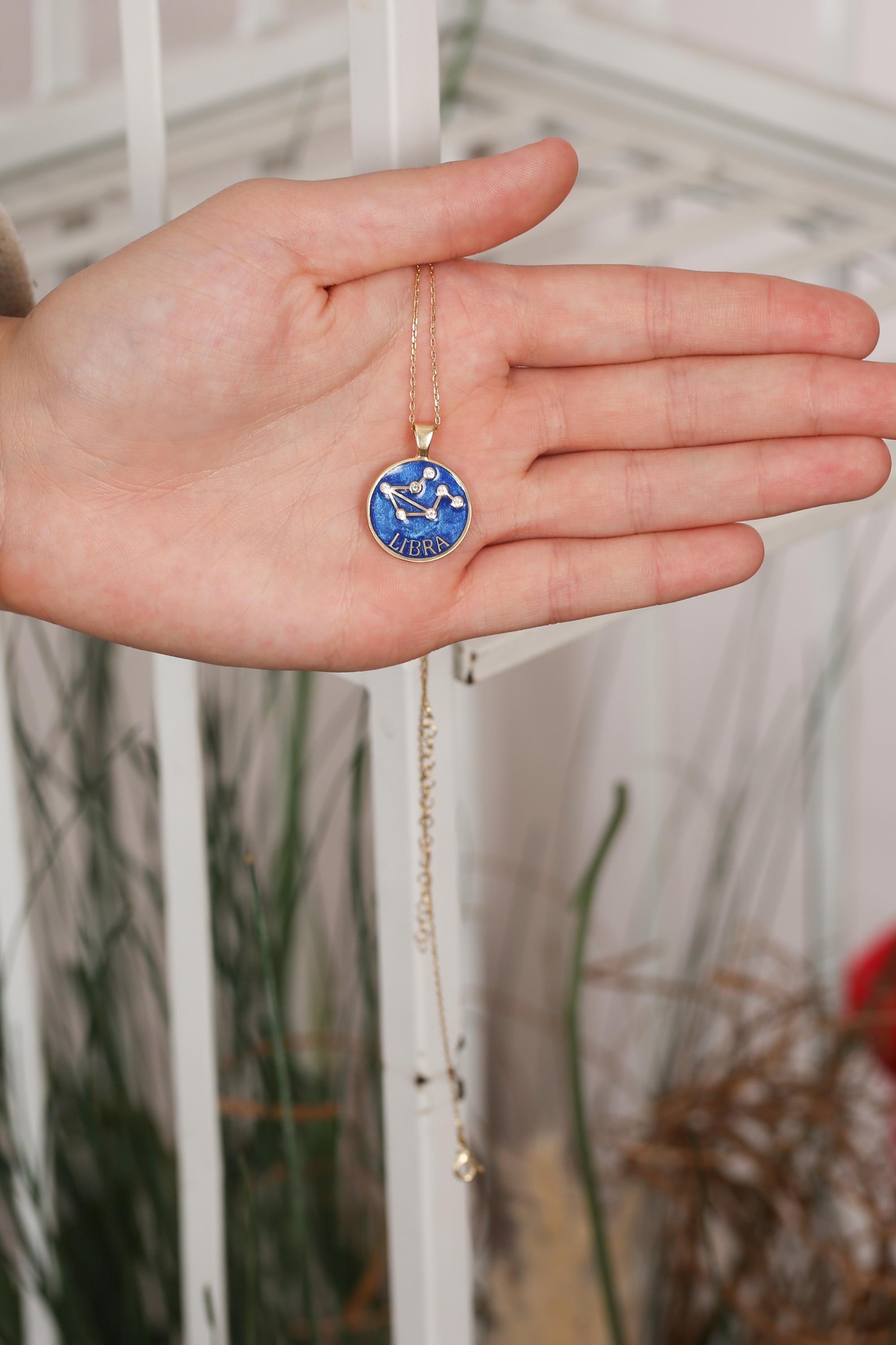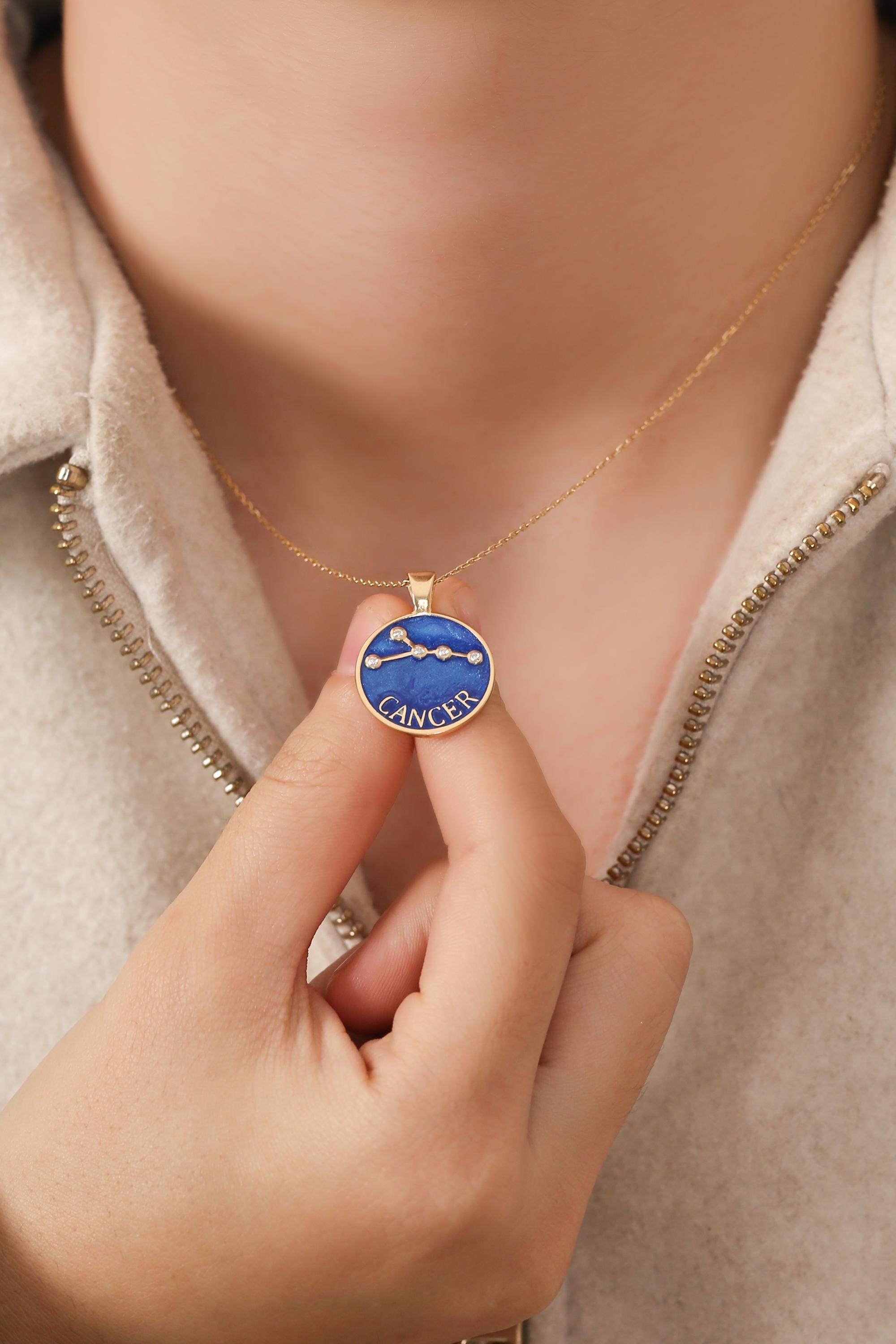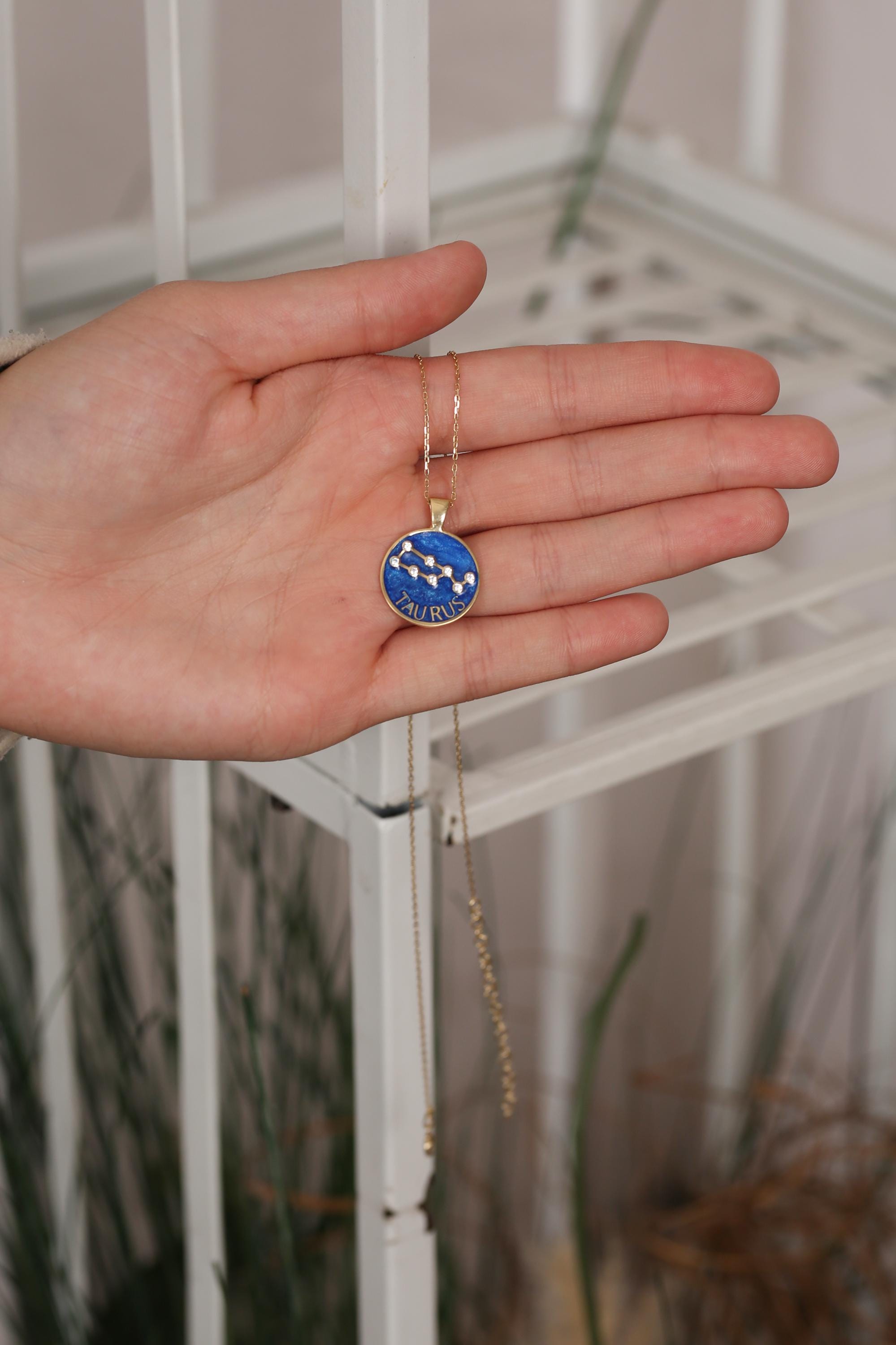 Each pendant is meticulously handcrafted with blue enamel and radiant gold plating, showcasing your unique horoscope sign through delicate, sparkling detail.