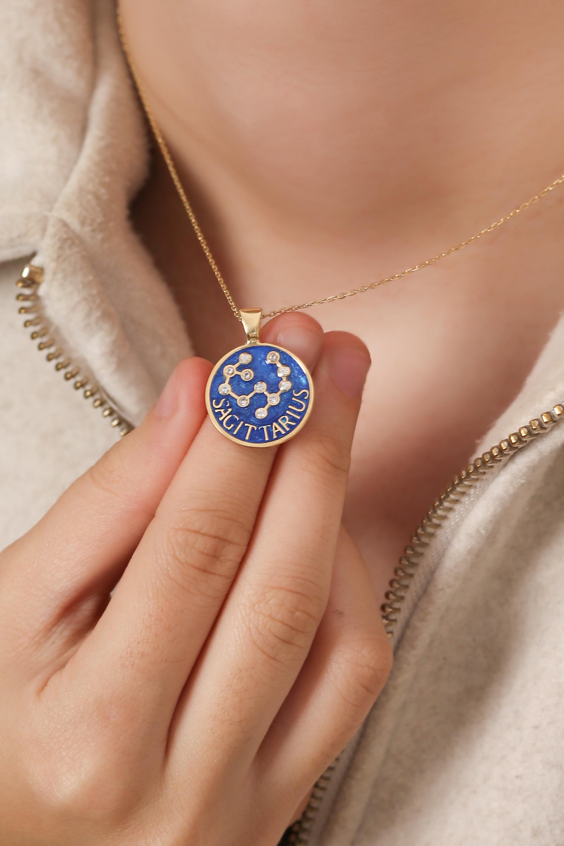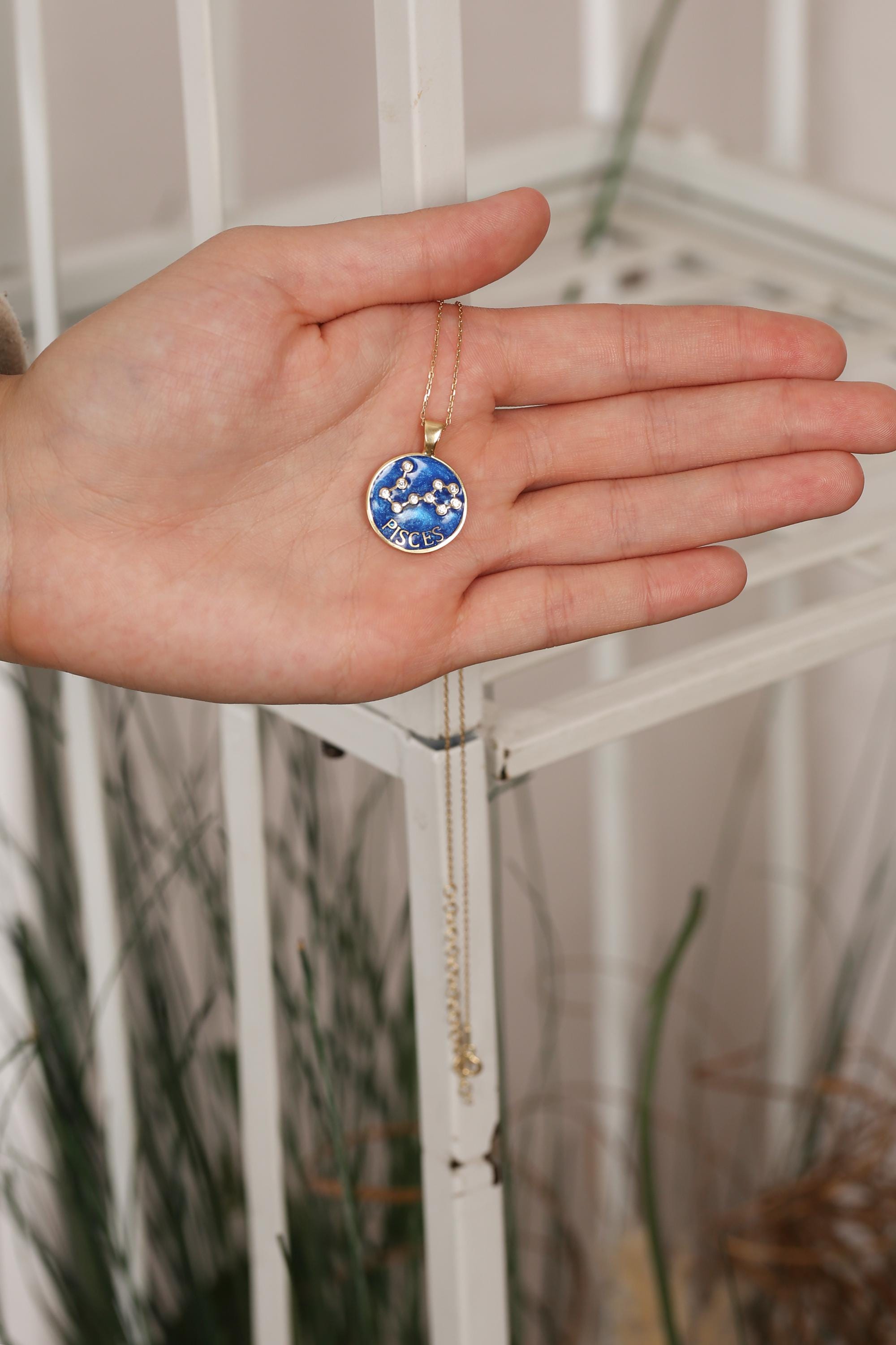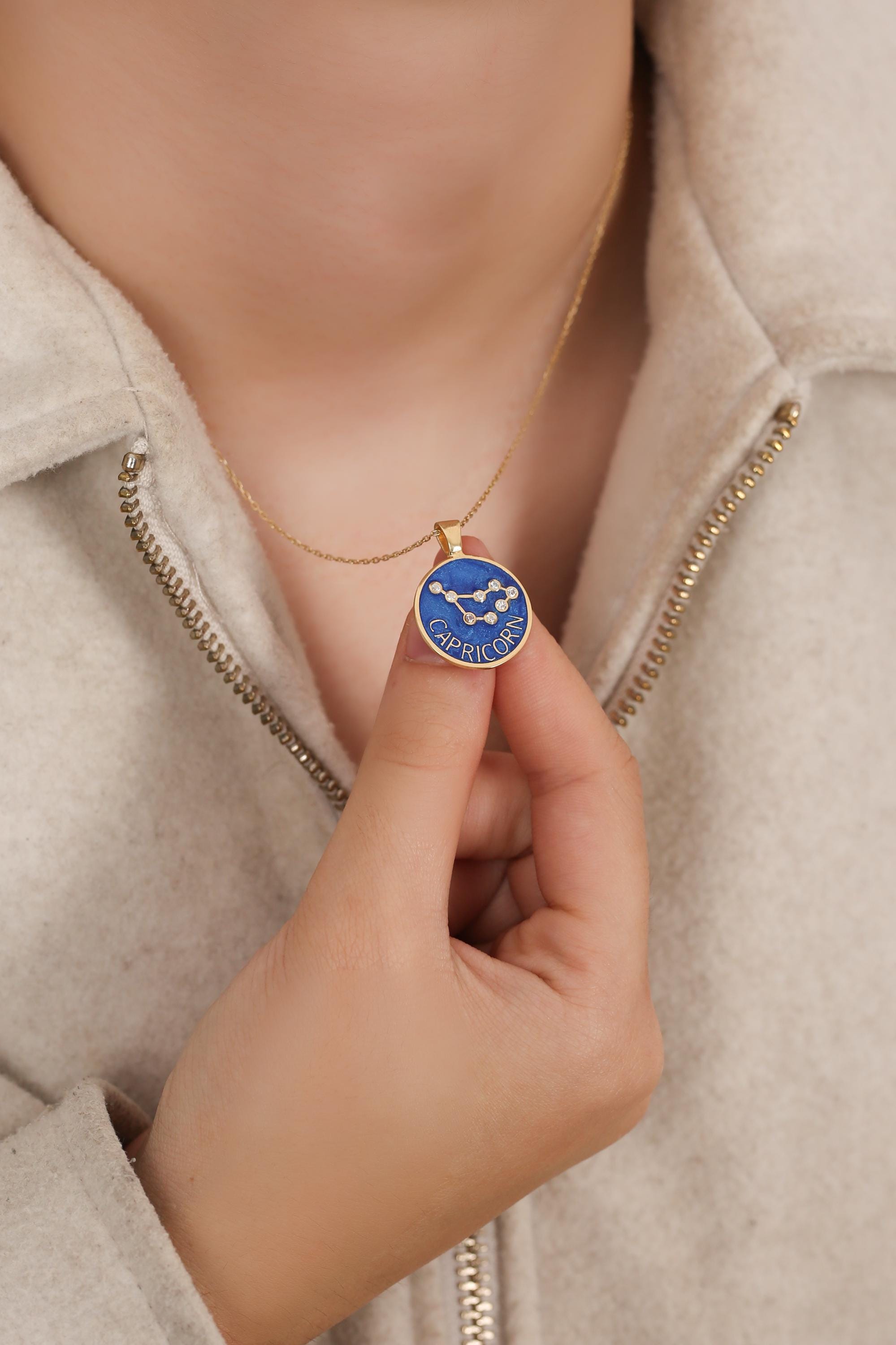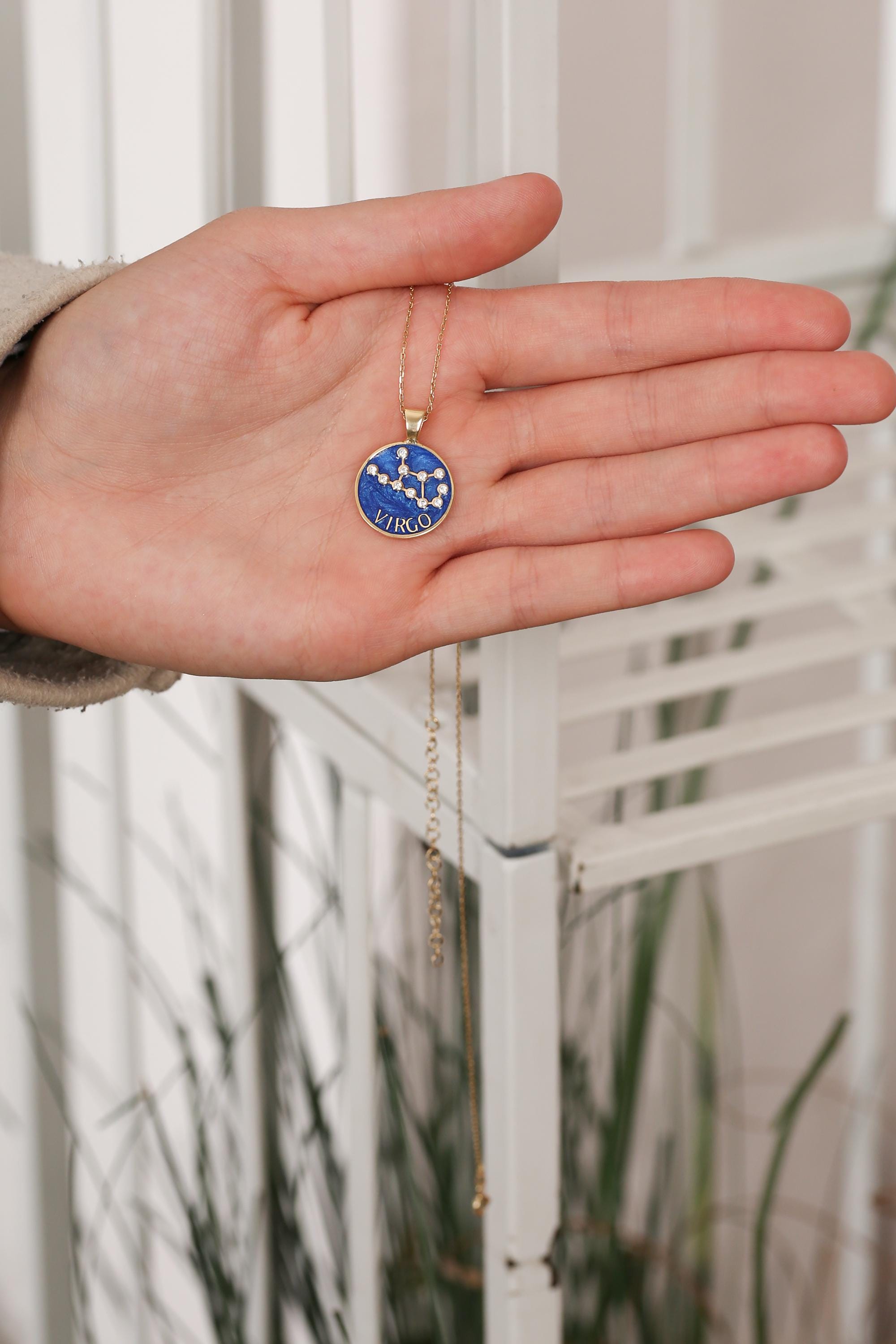 Each pendant is meticulously handcrafted with blue enamel and radiant gold plating, showcasing your unique horoscope sign through delicate, sparkling detail.