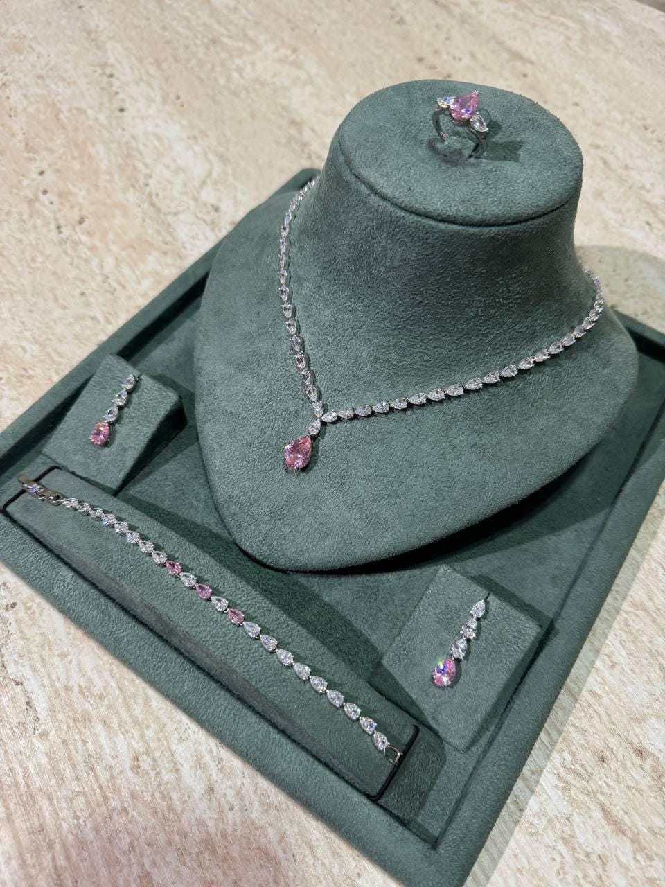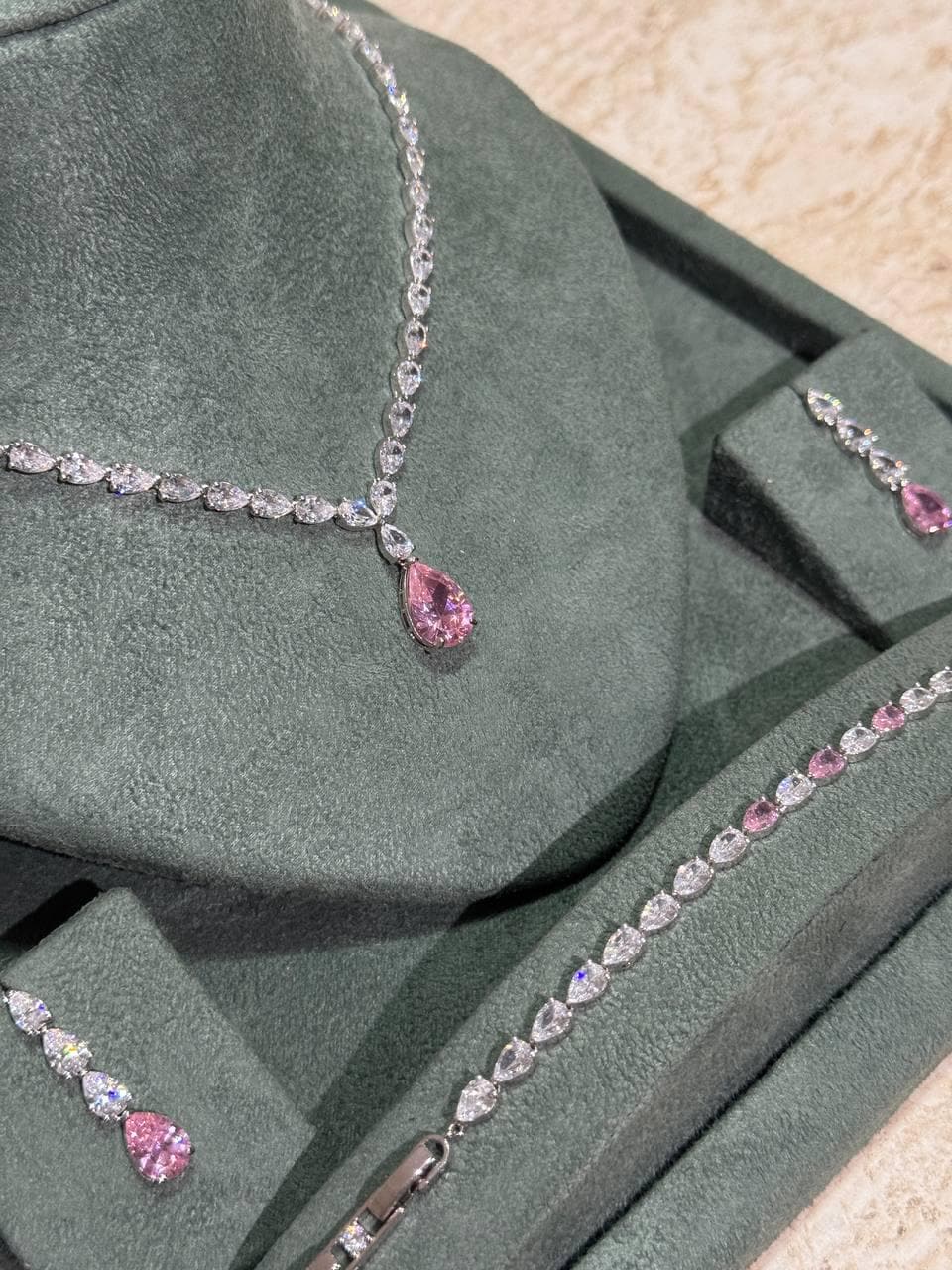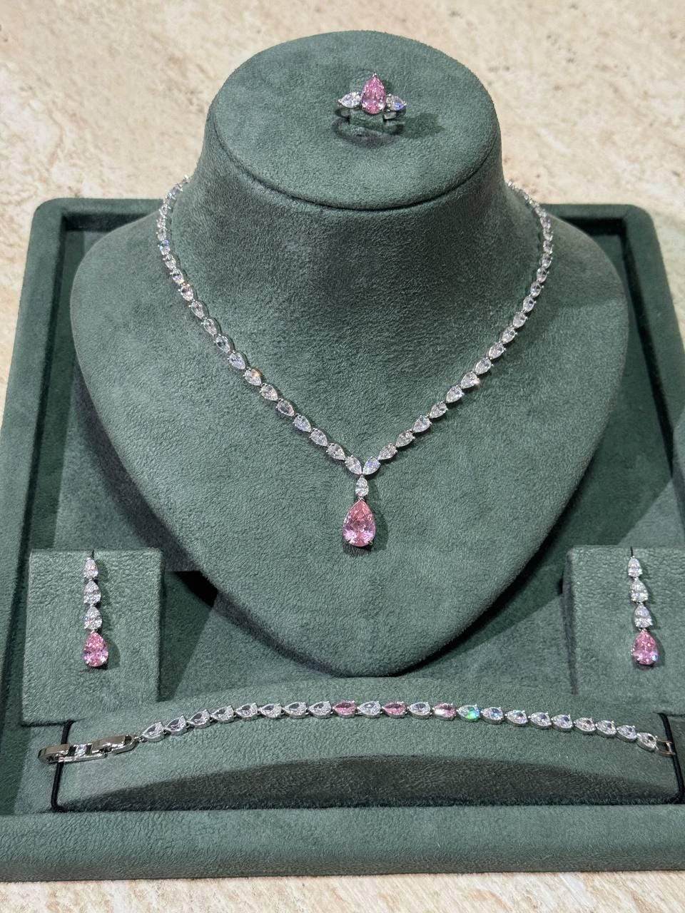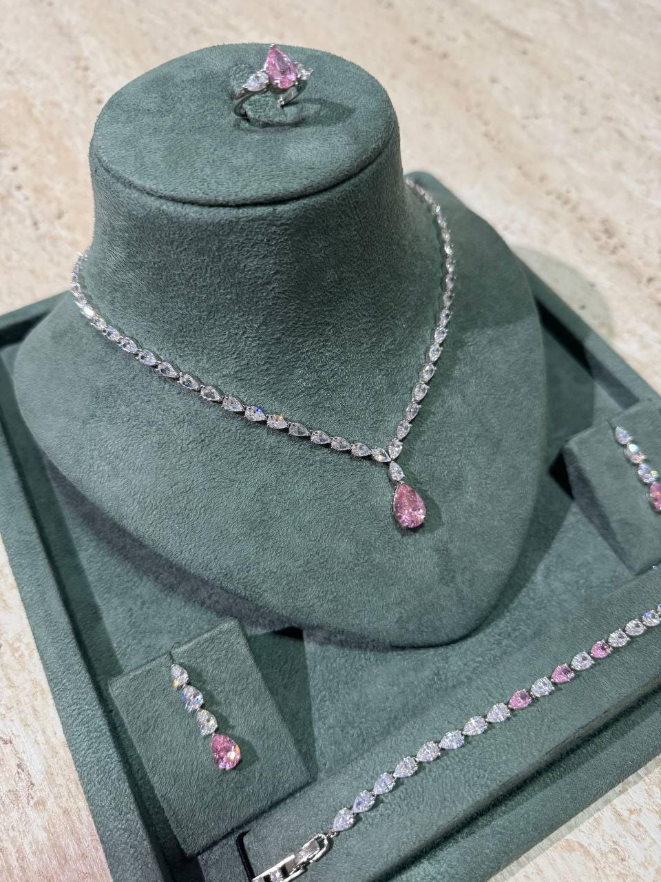This stunning Pink Pear Cut Jewelry Set is designed for the woman who loves timeless sparkle with a touch of color. Each stone is expertly hand-set with Swiss-cut cubic zirconia, creating a brilliance that rivals real diamonds — with a unique pink centerpiece that adds warmth, femininity, and luxury to every moment.