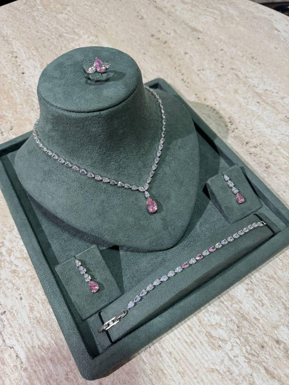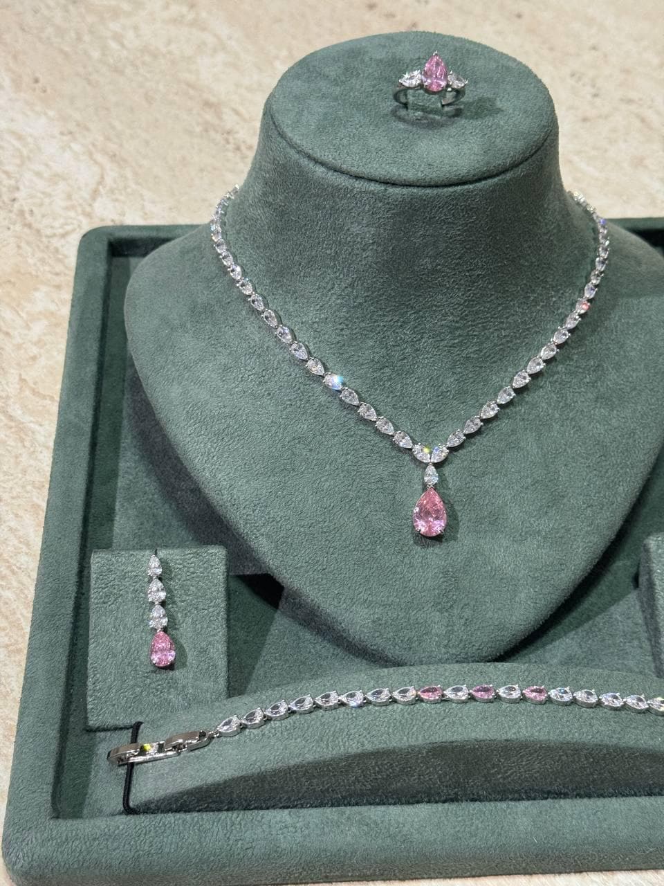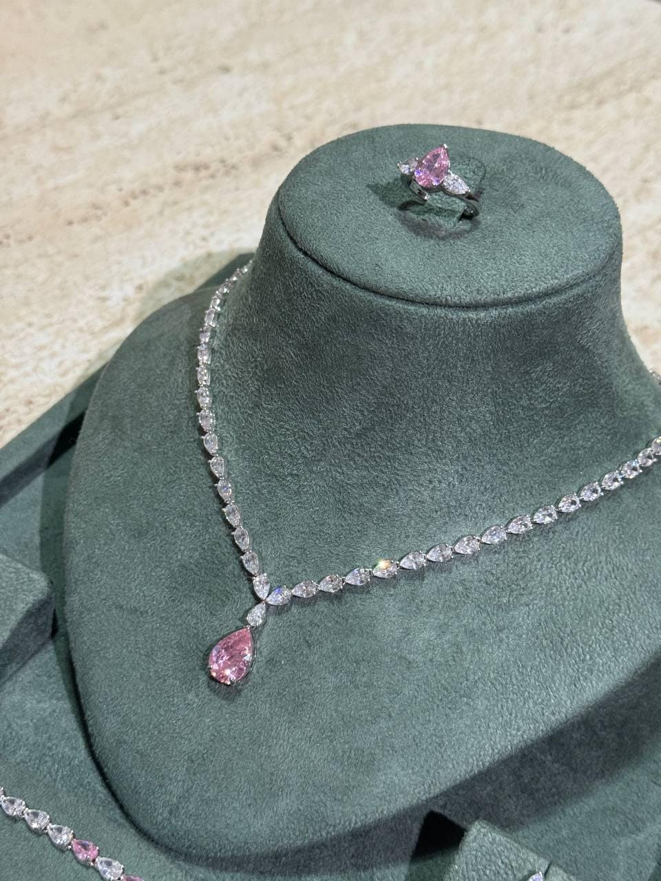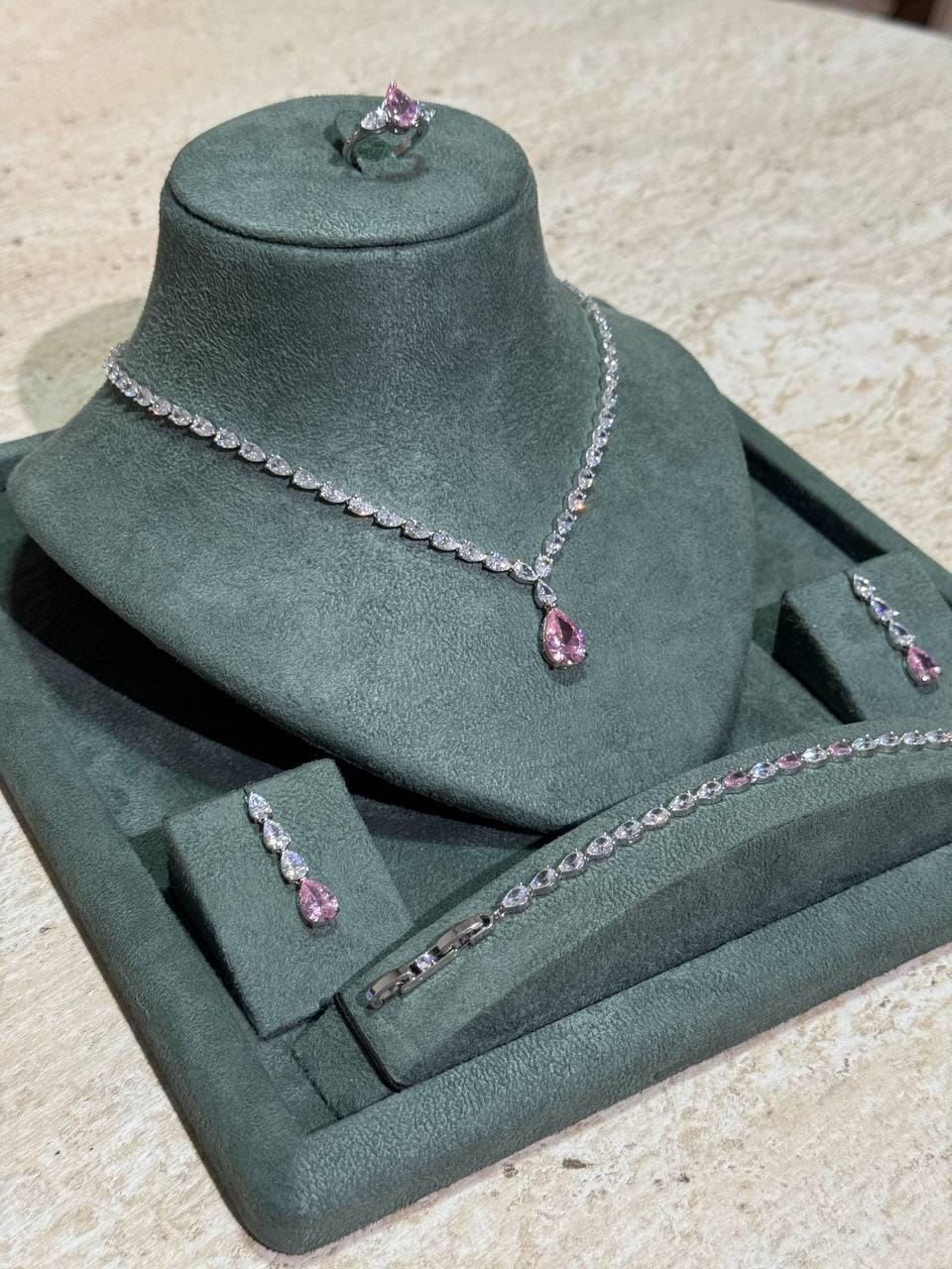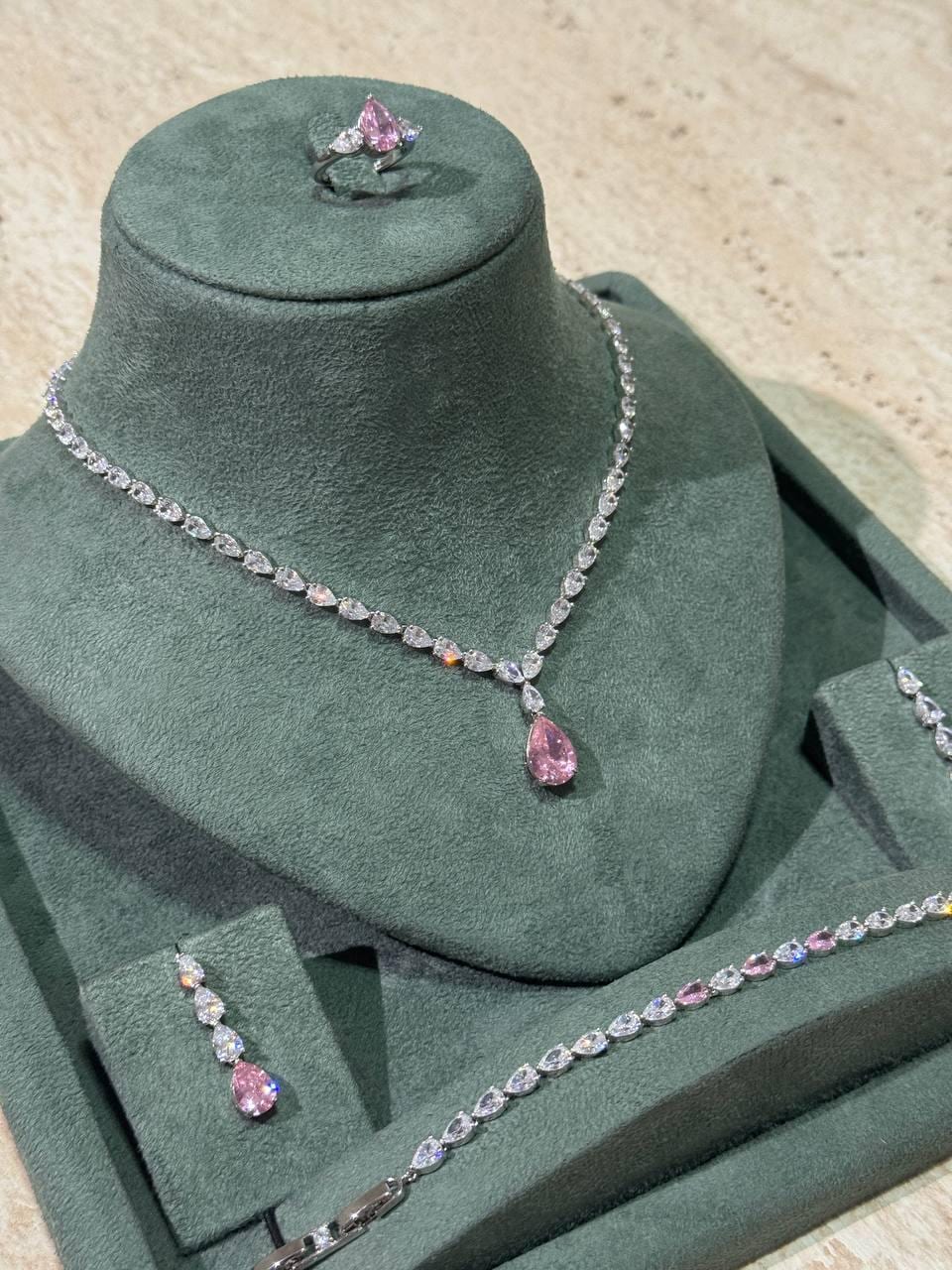 This stunning Pink Pear Cut Jewelry Set is designed for the woman who loves timeless sparkle with a touch of color. Each stone is expertly hand-set with Swiss-cut cubic zirconia, creating a brilliance that rivals real diamonds — with a unique pink centerpiece that adds warmth, femininity, and luxury to every moment.