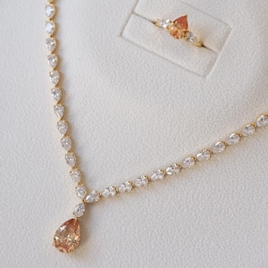 The necklace showcases a sleek, modern V-drop design ending in a radiant pear pendant — a silhouette adored in American bridal fashion for its sophisticated glow.