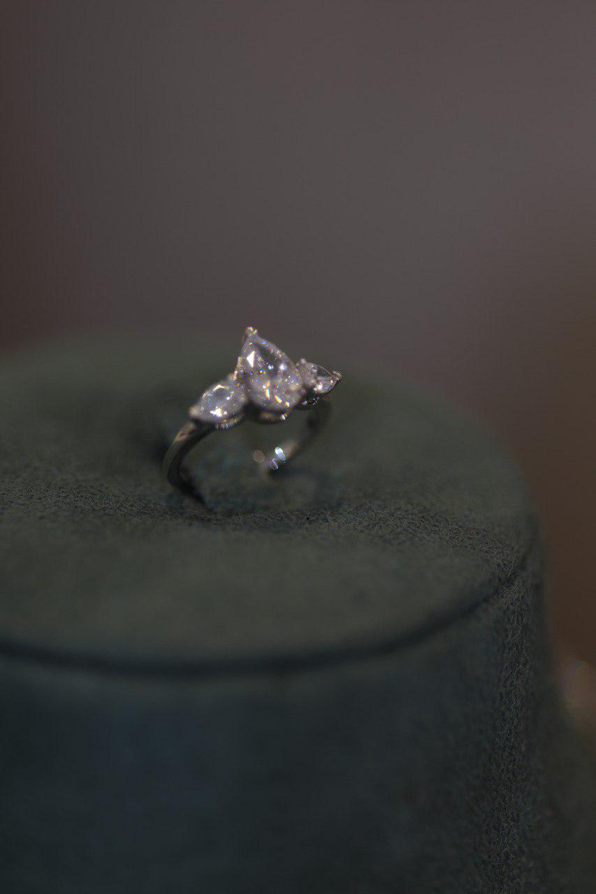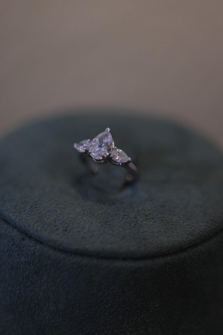 The ring adds a bold, high-shine finish with its three-stone pear cluster design.