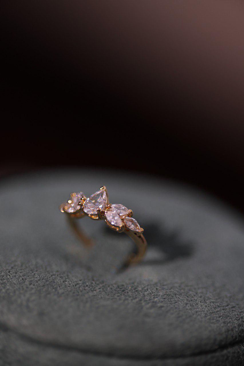 This design features marquise-shaped stones arranged like elegant leaves, combined with a pear-drop centerpiece for a timeless, royal finish.